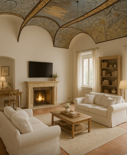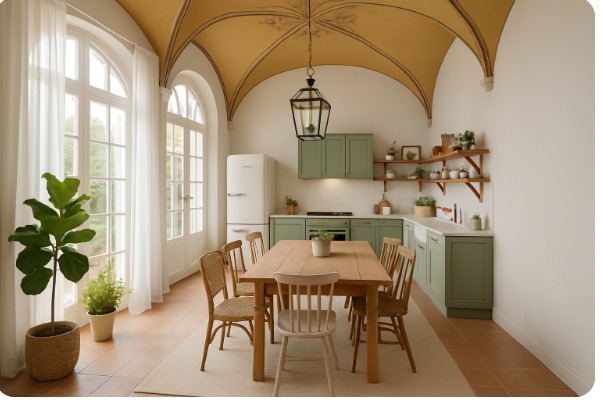Cucina e sala da pranzo dal carattere unico, avvolte da un suggestivo soffitto dipinto.
